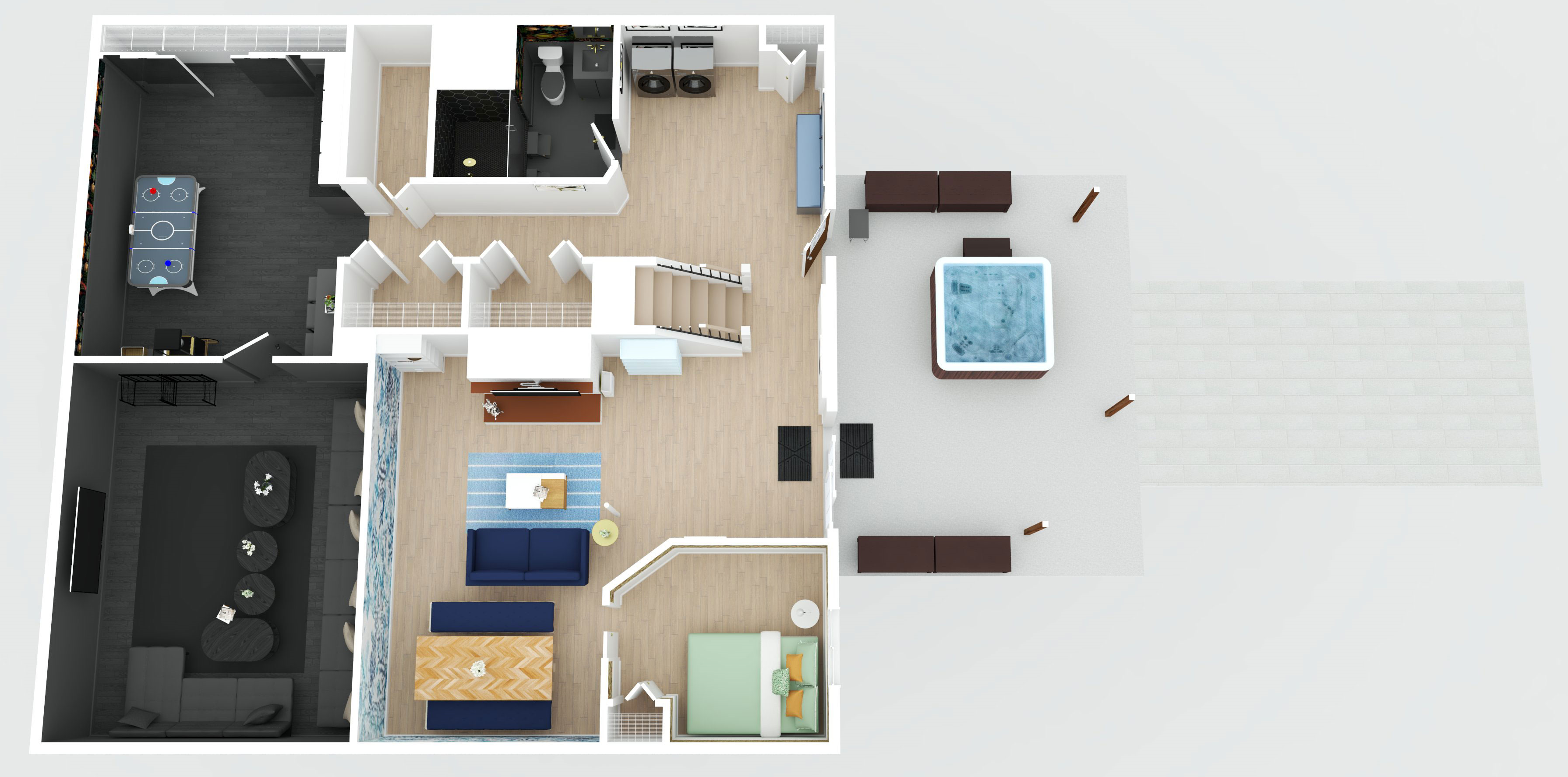 On the main level, you'll find two bedrooms with Cal king sized beds, each beautifully designed with murals and equipped with 50-inch Roku TVs. This floor also includes a full bath, with a marble vanity and a bathtub.
